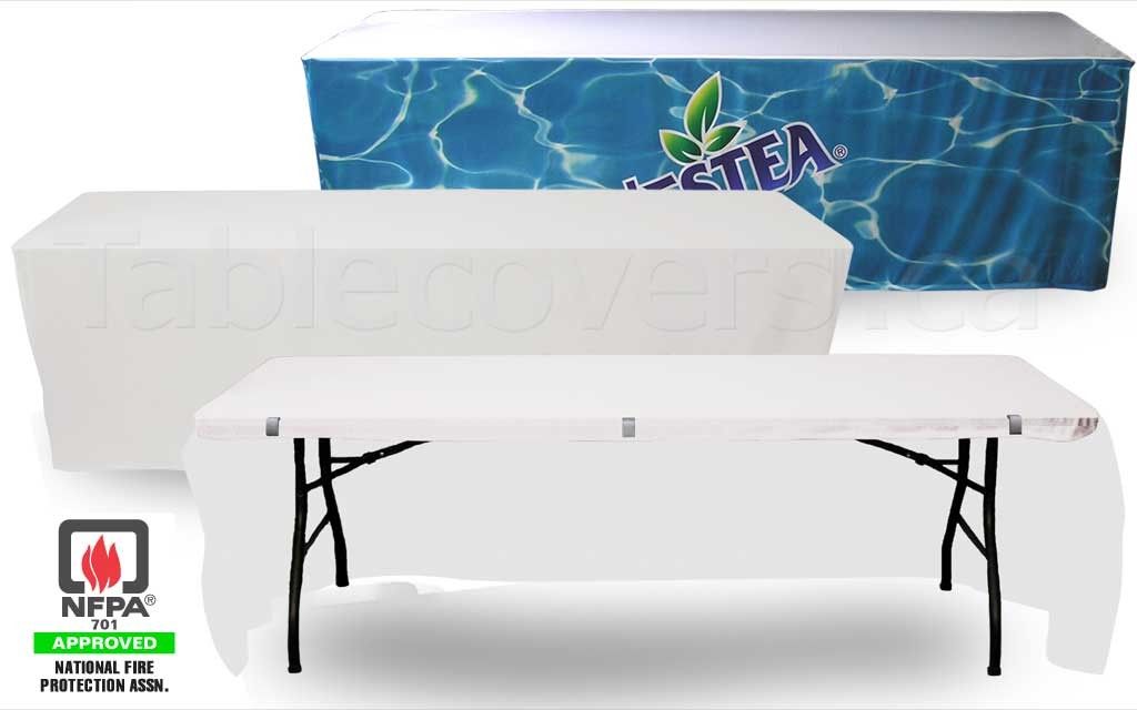 Graphic Setup: Production Time: - for Qty 1-4 pcs = usually 7 business days If timing is important please contact us to confirm. Need it faster? For quantities up to 4 pcs: MORE DETAILS: Custom printed table covers for trade shows & table top displays - by Canada's leading manufacturer of custom digitally printed table covers. Our tablecloths are custom made to order so they're right for you and we'll make your display table covers exactly how you want them - with no limits to colours, sizes or unusual shapes! Trade show table cover, printed tablecloth, custom branded table drape, logo table throw - whatever you call them, our custom digitally dyed fabric table graphics are the easiest way to turn a standard folding exhibit or banquet table into a professional, attention-getting display surface. These fire resistant trade show tablecloths are available in sizes to fit most common folding table dimensions - this model is made to fit a standard 8 foot folding table which is 96" wide by 30" deep by 29" high. Or for sales counters you can select the 42" counter height option with either a 24" or 30" depth. We also make covers for 4 foot (usually 24" deep) or 6 foot wide tables, or we can handle virtually any custom table size as well. We make them fast! Most orders are completed in about 7 business days from final artwork approval, and RUSH SERVICE as fast as 3 business days is also available. Customers usually need our table covers ready to use at particular trade shows or events which happen on certain dates. We know how important these deadlines are and we take your deadlines seriously. In fact, we've helped many customers who originally bought table covers from other suppliers and realized at the last minute that their order wouldn't be ready in time. Since we are the Canadian manufacturer, we totally control production so you won't hear excuses from us like "it's stuck in customs". We humbly believe that our custom logo tablecloths are the best on the planet. Check out why ours are the best at this link. While some other tablecovers are so-so, ours are spectacular! Our unique combination of just the right fabric (recycled fabric is also available), outstanding print quality and skilled professional sewing creates the most spectacular tablecloths anywhere. Compare our table covers with competitors products to see how much better ours look. If copying is the sincerest form of flattery, then the fact that we've found competitors stealing our photos to represent their products shows just how good our custom table covers look. We use high quality fabric that is inherently flame-resistant(we even include a certificate to prove it) so it meets exhibit hall fire code regulations (passes National Fire Protection Association NFPA 701 Small Scale & California Reg#F-50001). Click here to see why it's important to choose table covers made from flame resistant fabric. Plus, it's completely washable and ironable so there's no worries if (when) you spill a coffee on it! The front and sides of this table cover are all permanently dye sublimation printed (using extended life dyes) with any content and colours (washable, ironable) into 100% polyester knit premium wrinkle resistant, flame retardant fabric (or optional recycled polyester fabric made from plastic bottles!). We use 220 gsm - grams per square metre - (6.5 oz./yd²) high density premium weight FR fabric for deeper, richer, vivid colours and a more professional appearance. Our fabric's thicker density is over 60% higher than some competitors who's flimsy, thin 137 - 180 gsm (4 oz./yd²) fabric is more see-through, less vibrant, and not nearly as durable! Many competitor's fabric feels like either a cheap nylon flag or a cheap vinyl banner - neither type compares to the quality appearance and feel of our premium fabric. The standard open back drapes over the top, front and sides of a standard trade show exhibit table, and leaves the back of the custom printed tablecloth open to give easy access to storage under the table. The fabric extends about 2" over the back edge of the table, and for open back covers we include 3 plastic table edge clips to hold the cover securely in place on slippery tables. Or you can select the closed back option, which adds fabric to the floor on the back of the table. Closed back models are great for centrally located tables or situations where you want to store unsightly supplies under the display table. Our table covers are made for a great fit on a certain size table, but many customers are concerned about whether the cover will fit the table they happen to get from the trade show or conference. You don't need to worry about it not fitting because all of our branded tablecloths are adjustable so they can fit on different table widths with just some minor tucking under of fabric at the left and right edges of the table. There's no need for messy-looking velcro like inferior convertible table throws use. As long as you buy a cover that fits the largest table size you'll need to cover and you keep the printed area within the space available on the smaller table size, it will also fit and look great on smaller tables. For example, you could get an 8' table cover and also use it on 6' wide tables. For more details, see How to use our adjustable size (convertible) table covers ( https://www.signsplus.ca/Adjustable-Size-Convertible-Table-Covers.html). With our digital dyeing process, any areas of the tablecloth which have custom printed content or need to be a particular background colour are completely dyed (both foreground and background are dyed) into white fabric. Unlike older, inferior methods, it is not possible to digitally dye white or other colours onto previously dyed (coloured) fabric - any areas in which custom content is required (logo, text, photo, etc.), OR areas which require a particular background colour that's not plain white, must be custom dyed. We use the latest technology instead of old-school produc