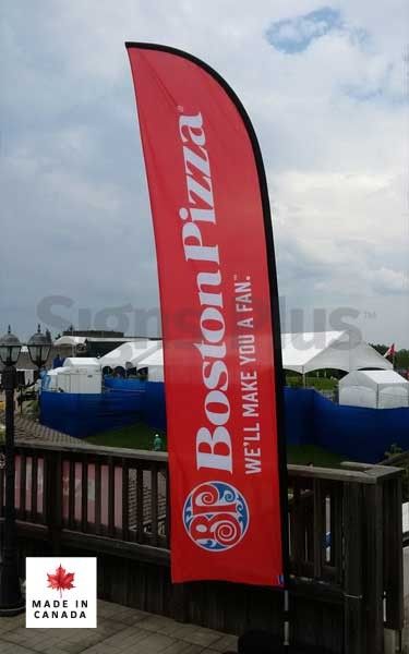Our high quality Canadian made advertising feather flags are an excellent awareness and branding product for outdoor or indoor trade shows, special events or retail promotions. Lightweight and easy to assemble, they display a custom printed fabric advertising or promotional flag (banner) which flies nicely in a gentle breeze and is supported for maximum visibility even when there’s no wind. This kit includes the pole hardware for a 35" wide x 160.5" high display; with 30.5" wide x 153" high single-sided or optional double-sided dye sublimation custom printed fabric flag; and your choice of base (either the patent-pending ground sleeve or steel cross base floor/ground stand).