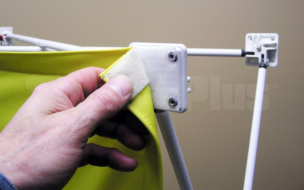 Material: Fabric Graphic - 100% Polyester Knit inherently flame resistant fabric passes NFPA 701 fire resistance rating Style: - (f) FRONT & SIDE panels (area) are custom dye sublimation printed with whatever logos, content or colours you want (foreground and background is printed); the back of the frame is exposed with no fabric Graphic Size: Weight: MORE DETAILS: The Velocé Image is a basic economical pop-up tabletop display which has a light weight yet strong tubular metal pop-up scissor frame that expands like an accordian to open, and suspends a dyed fabric graphic mural. It sets up in about 20 seconds and is absolutely the easiest and quickest portable tabletop display to set up! The Velocé Image 3x2 7.5 foot wide straight display has an 85.5" wide x 57.5" high x 14" deep display size which gives plenty of space for a display with impact and its straight shape provides good visibility from many angles. To set up the display, you just expand the frame like an accordian, then join the locking arms at the hub locations around the perimeter of the frame (and one in the middle) and you're done! The permanently dyed (washable, ironable) polyester knit fabric graphic stays Velcro'd to the frame even when it's stored away, so there's no time wasted attaching it to the frame. When the frame is collapsed, the fabric may look somewhat wrinkled, but as you expand it the wrinkles are "pulled" out so the fabric looks smooth and flat. Most exhibit spaces now require flame-retardant materials and this inherently flame resistant (IFR) fabric passes NFPA 701 Small Scale certification, so it meets fire code regulations. The printed fabric graphic connects to the hubs around the perimeter of the frame with Velcro tabs so it is possible to order a new fabric graphic and you can then put a new graphic on an existing frame in the future, quickly and easily. The display can be transported or stored in the included lightweight soft nylon carrying bag, or you can order an optional molded hard shell plastic shipping case with wheels. Each Velocé Image complete kit comes complete with lightweight formed metal scissor style pop up frame, soft nylon carrying bag and printed fabric graphic. The printed fabric graphic includes full digitally dyed content and velcro tabs sewn at hub locations around the perimeter to attach onto the frame. Velocé Image is available in several different sizes in straight models to suit everything from table-top to large space use. Ideal for use as a trade show exhibit backwall, media wall, press conference step and repeat logo background, or graphic image backdrop. With a large, clean image area they're very effective, and their easy setup makes them a pleasure to use. |